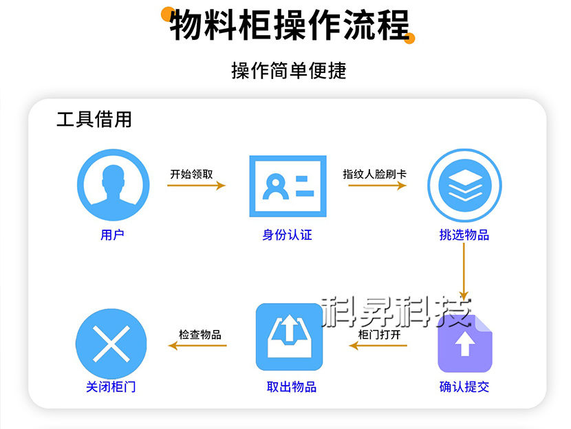屏幕点击登陆→输入账号密码/刷卡/人脸登陆→点击工具借用→选择领用物品→取出物品柜体扫码物品二维码→关闭箱门:物品领用成功